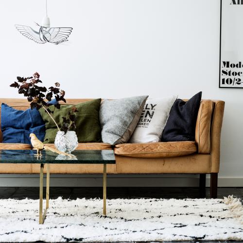 Perfect for a spacious sofa or bed. Play with layers, shapes, and textures – square and rectangular cushions in mixed colours and patterns. Add a blanket in wool, cotton, or bouclé to complete the look. It’s all about creating an inviting whole – not perfection.