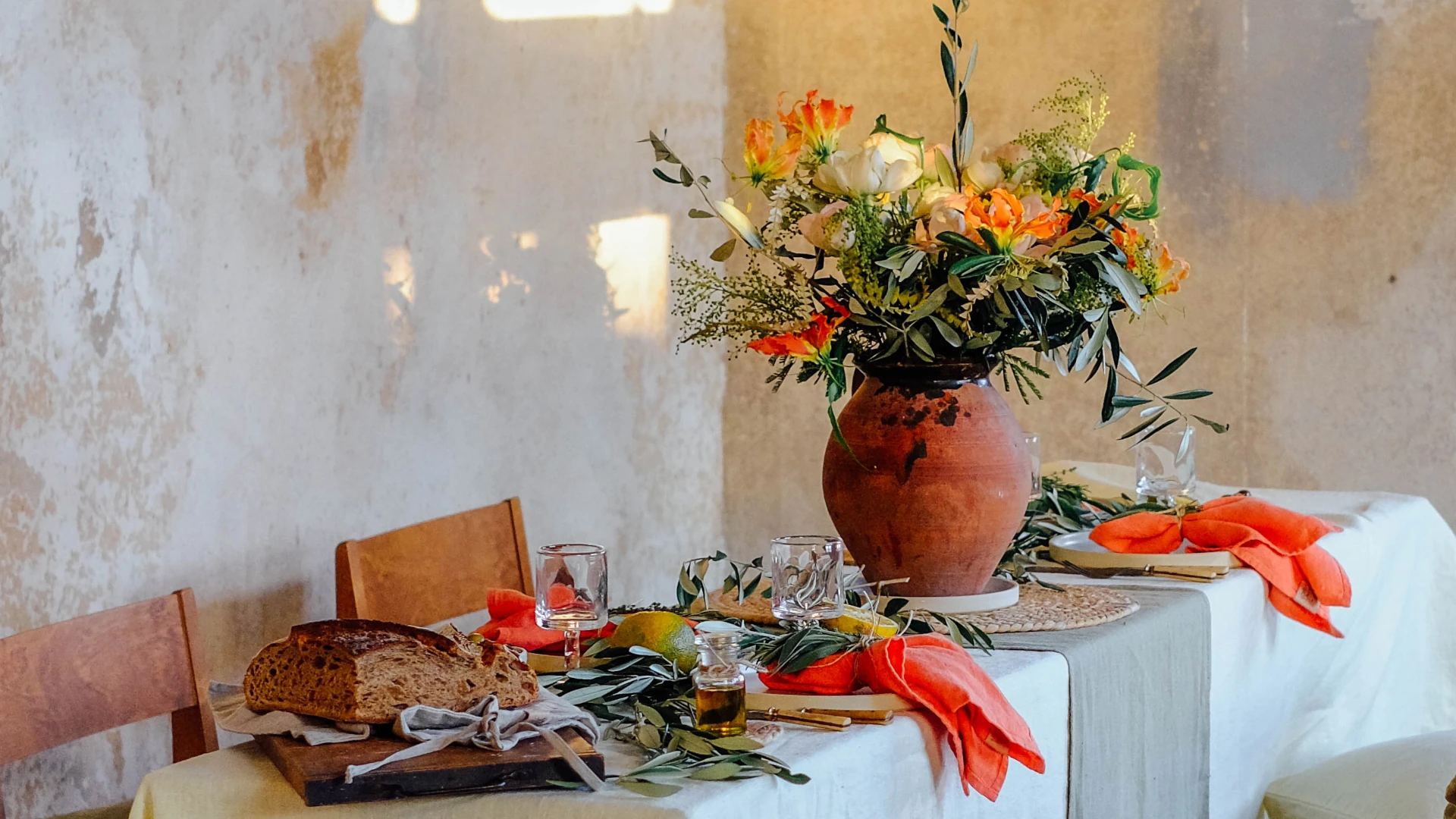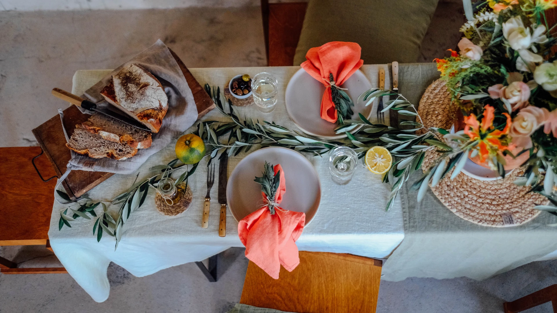 Här är produkterna som bygger upp dukningen. En duk i Lemon Sorbet ger en ljus bas. Lägg till servetter i Peach för värme och en löpare i Avocado för kontrast. De naturliga jutedetaljerna bryter av och ger bordet struktur.