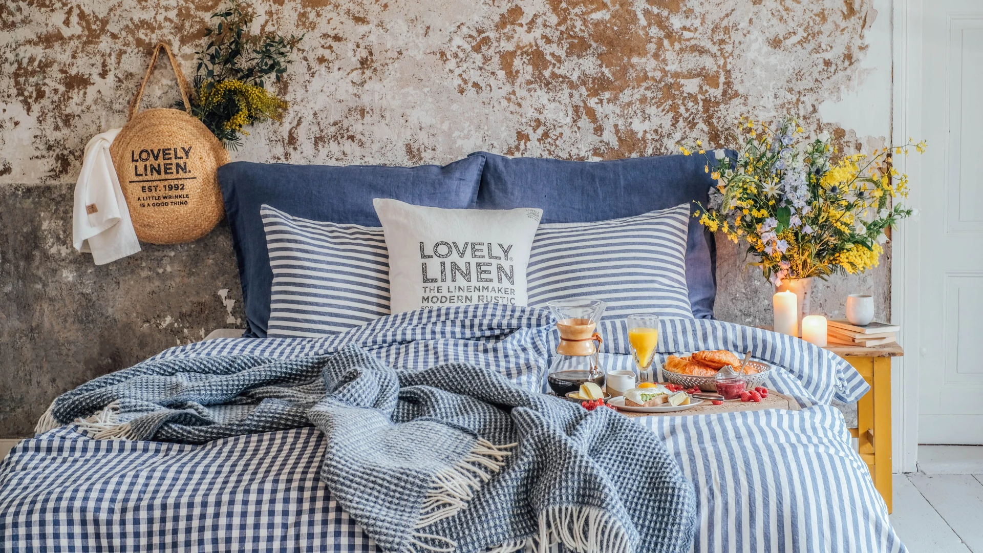 Här är sängkläderna och andra detaljer som bygger upp bädden. Påslakan och örngott i linne i Edge Denim Blue och Square Denim Blue skapar en levande bas där rand och ruta möts i lager. Lägg till örngott i enfärgad Denim Blue som binder ihop helheten och ger ett lugnare uttryck. Tillsammans med vitt i Off White och en mjuk ullfilt får bädden en fin balans där blå toner, mönster och naturliga material samspelar i en avslappnad helhet.
